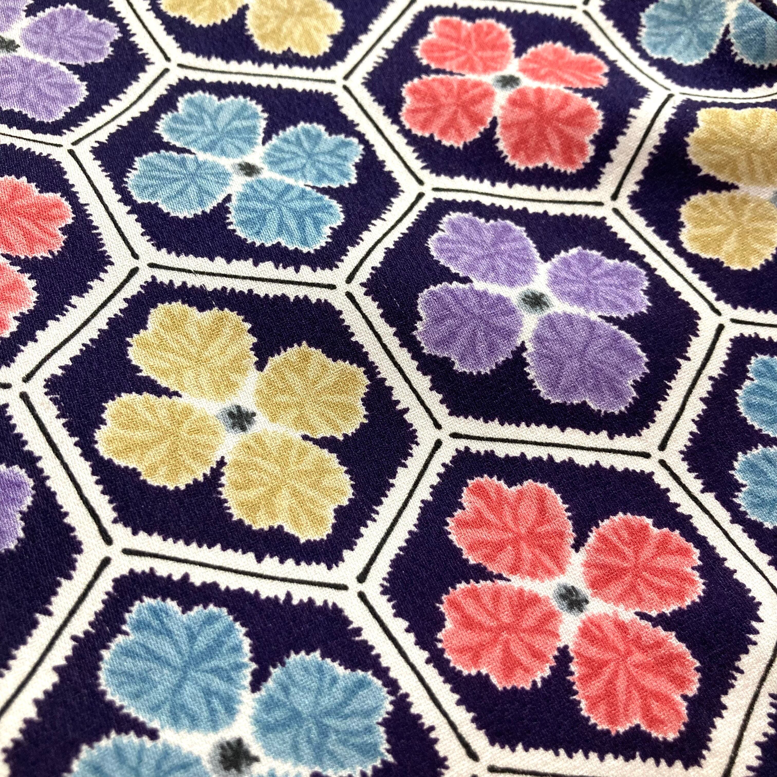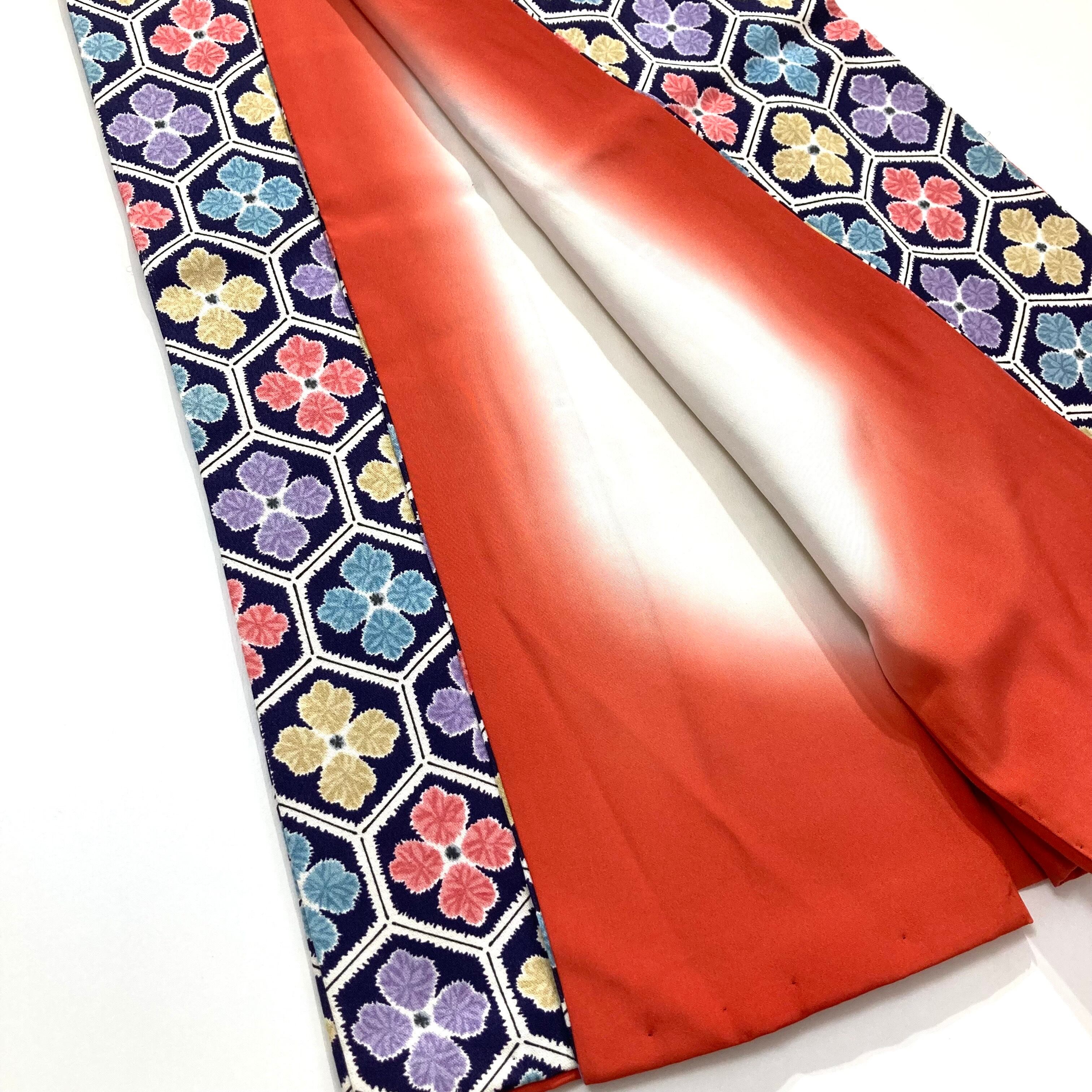 広衿仕立ての袷小紋です。亀甲にカラフルな花がポップな小紋です。生地に擦れなどがございますが、着用汚れは、ほぼなく、美品です。袖丈が57㎝と少し長いので、袴に合わせても可愛いです♪