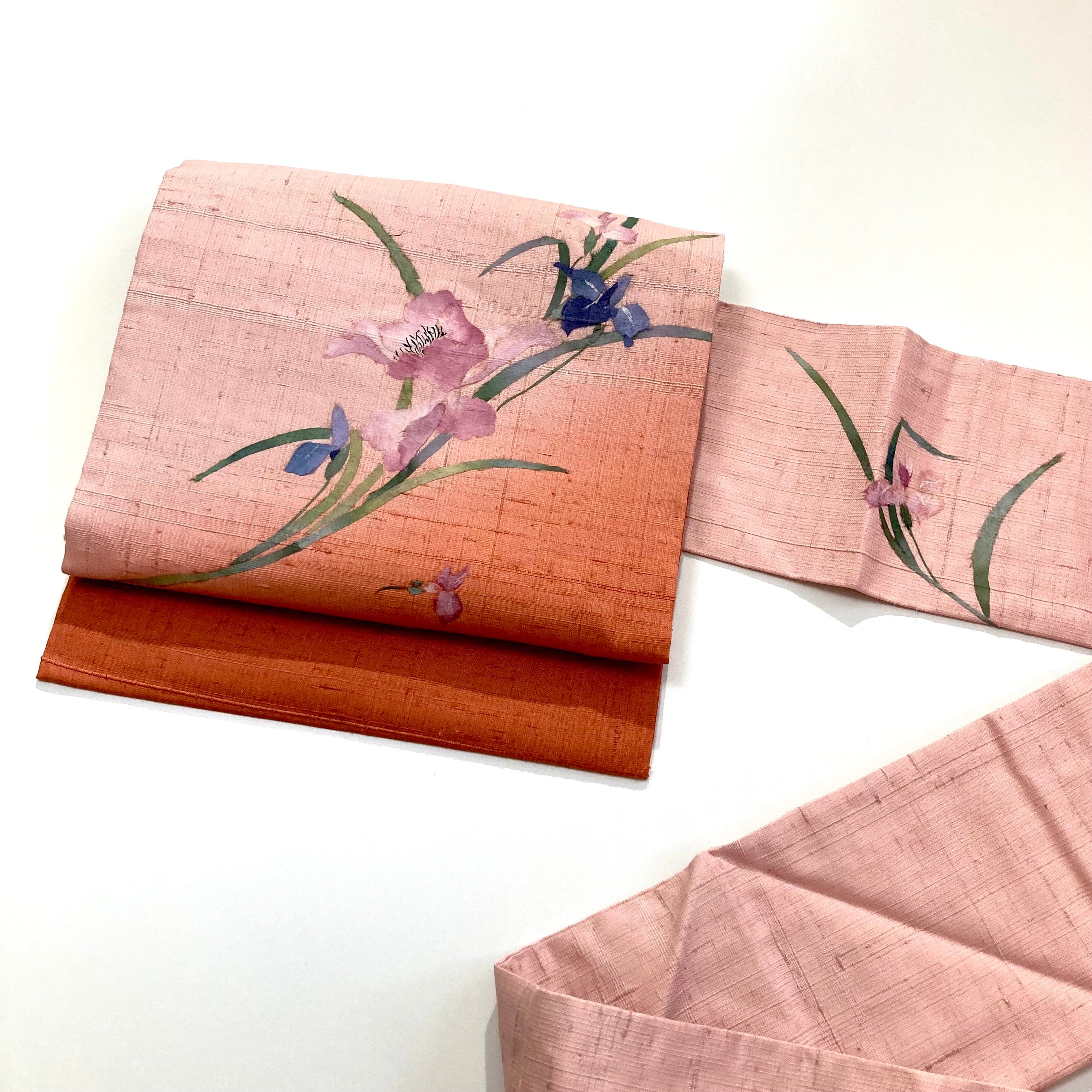 ちぎり絵の珍しい名古屋帯です。オレンジからピンクのグラデーションに可憐な杜若が品よく愛らしい!前腹は、関東巻きだとブルーの杜若(かきつばた)、関西巻きだとピンクの杜若が出ます。紬地なので、カジュアルな装いがおススメです。