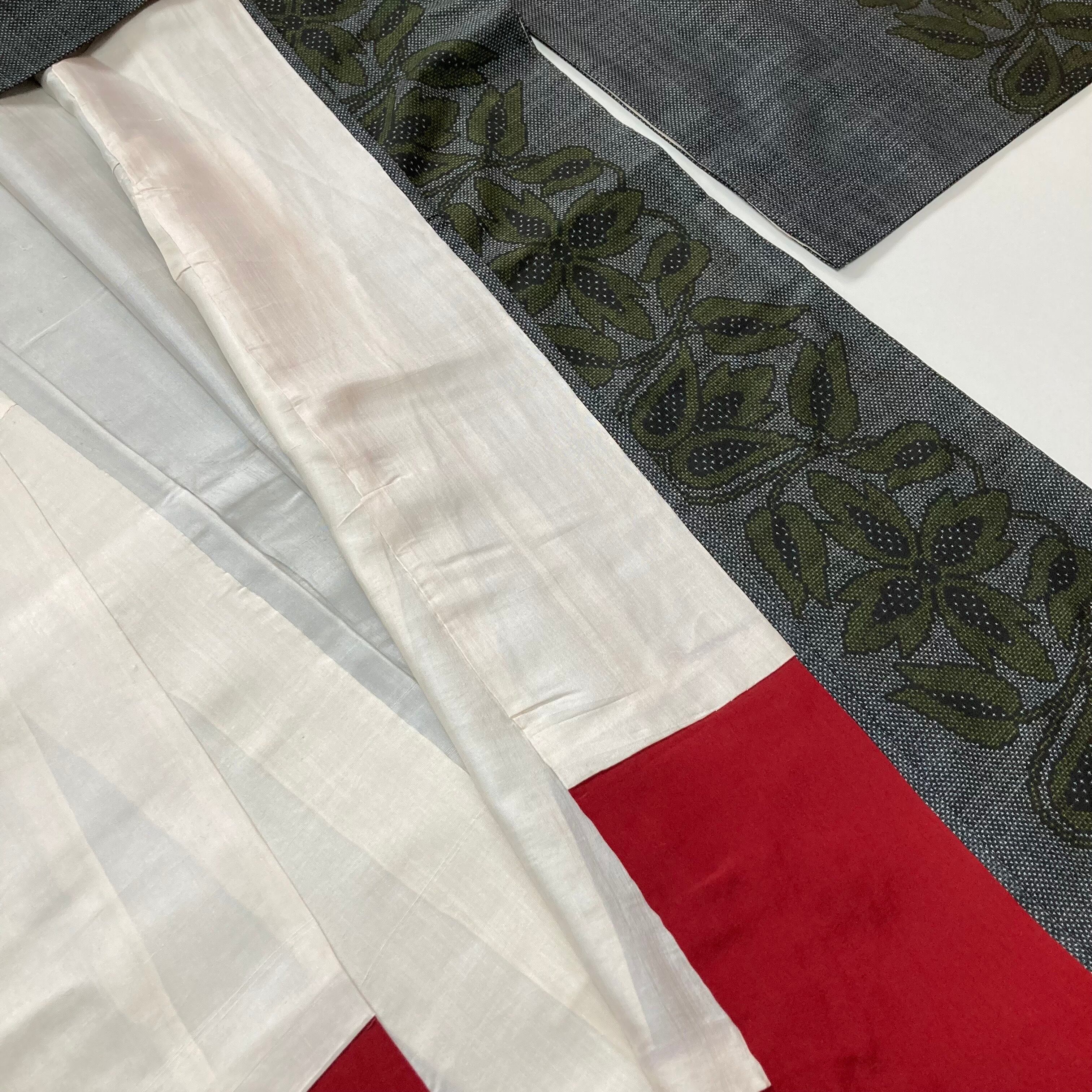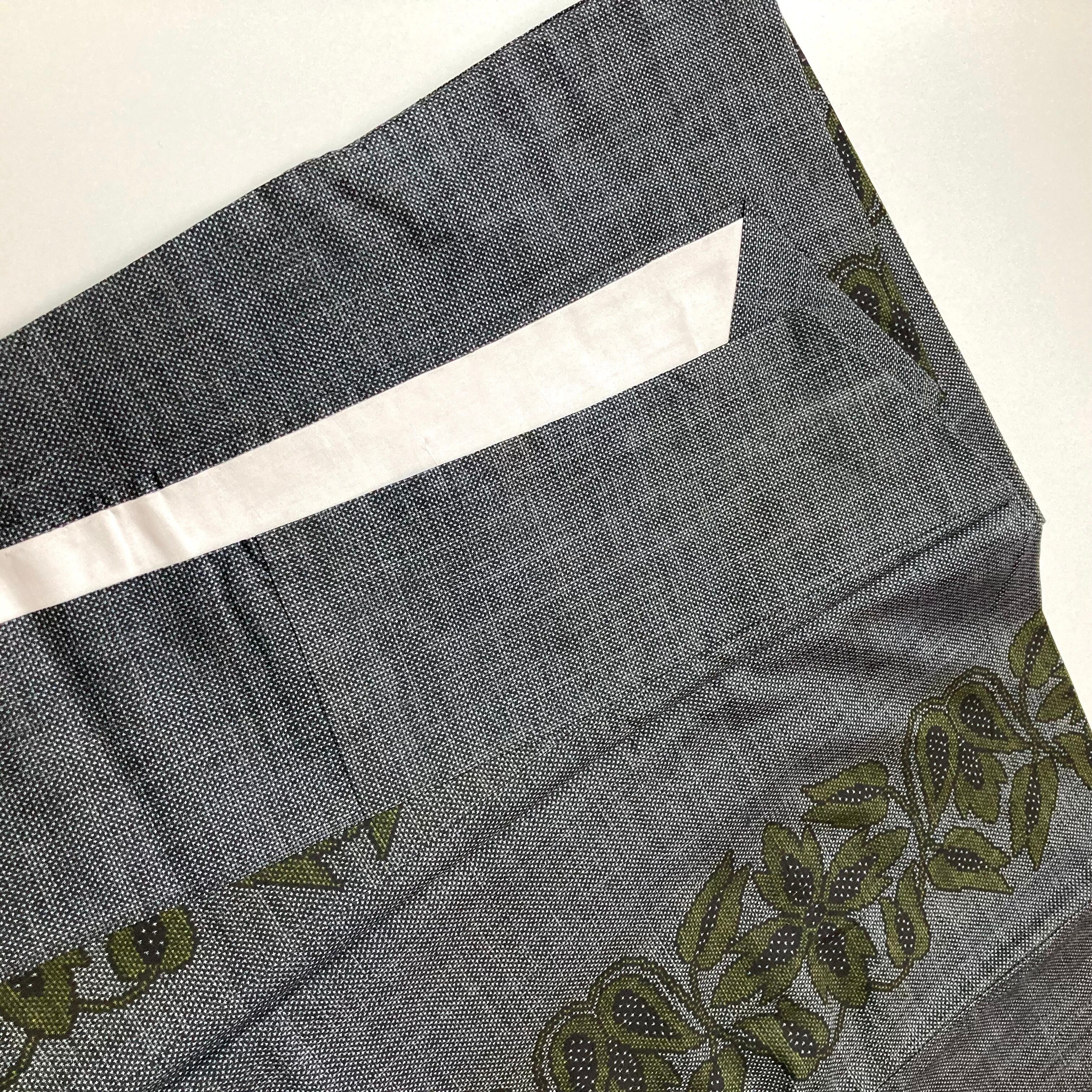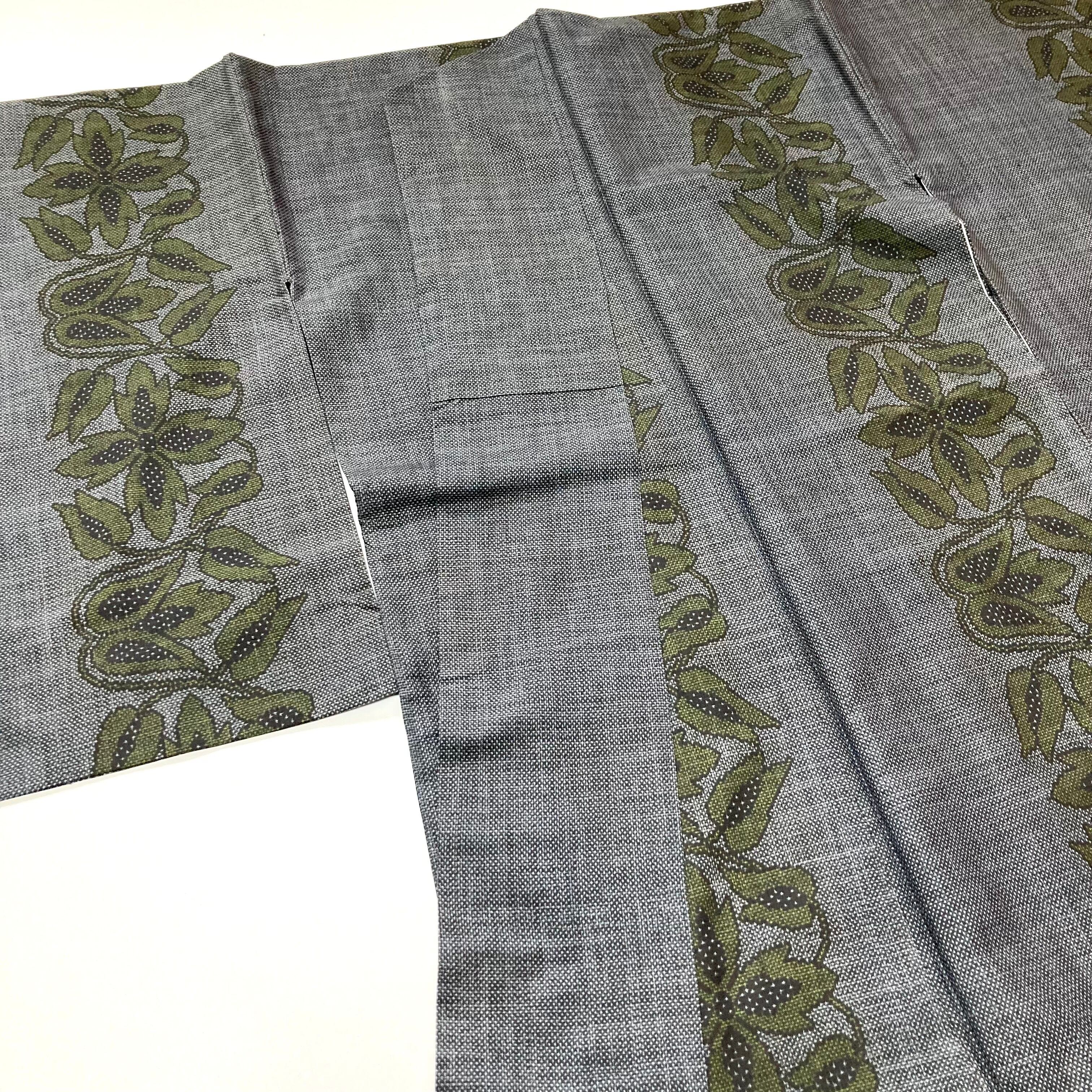 グレイ地にモダンな花模様がとても大人可愛い大島紬です。八掛は紅色。広衿仕立て、衿に少少々着用汚れがございますが、袖口や裾はきれいです。