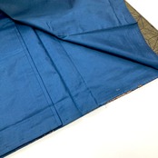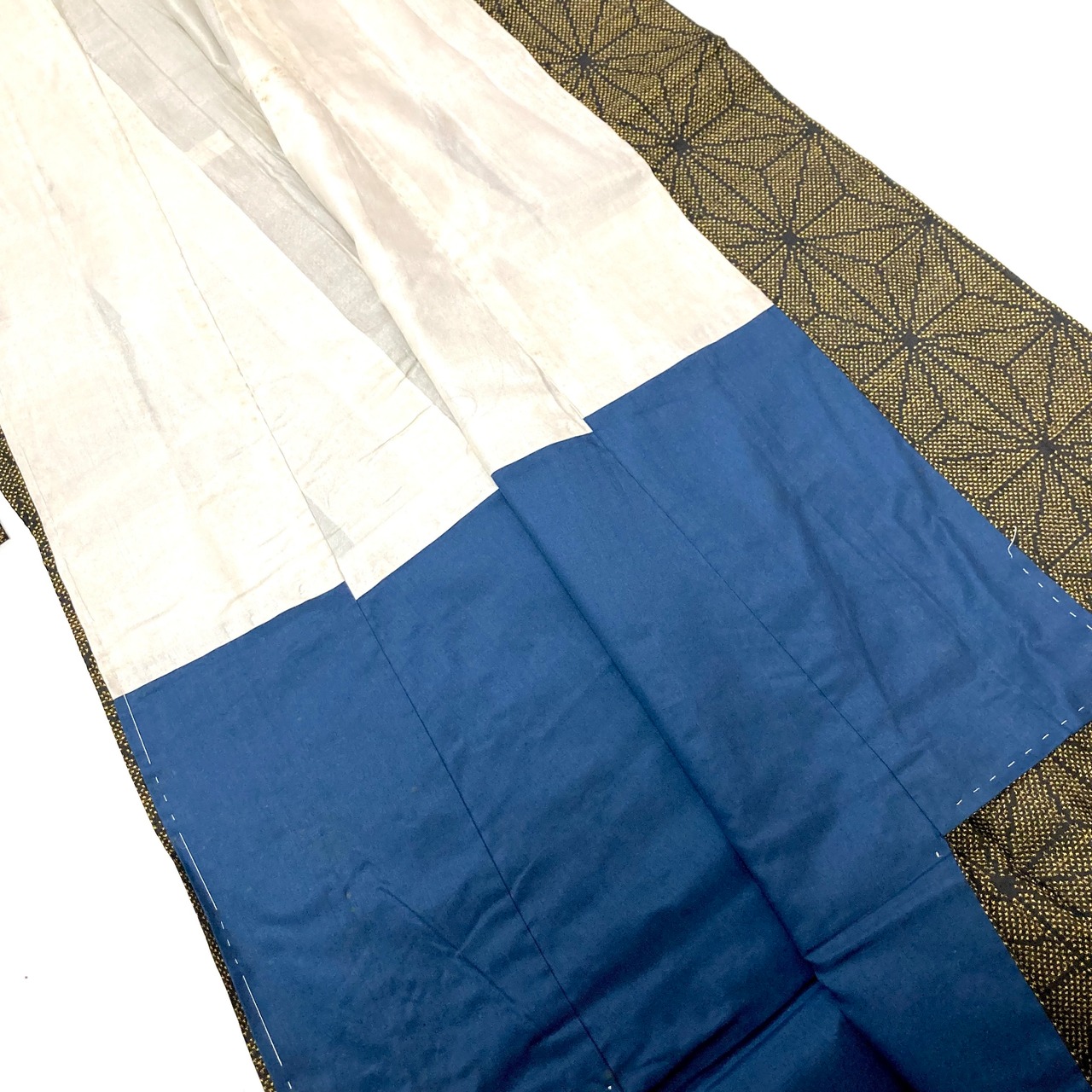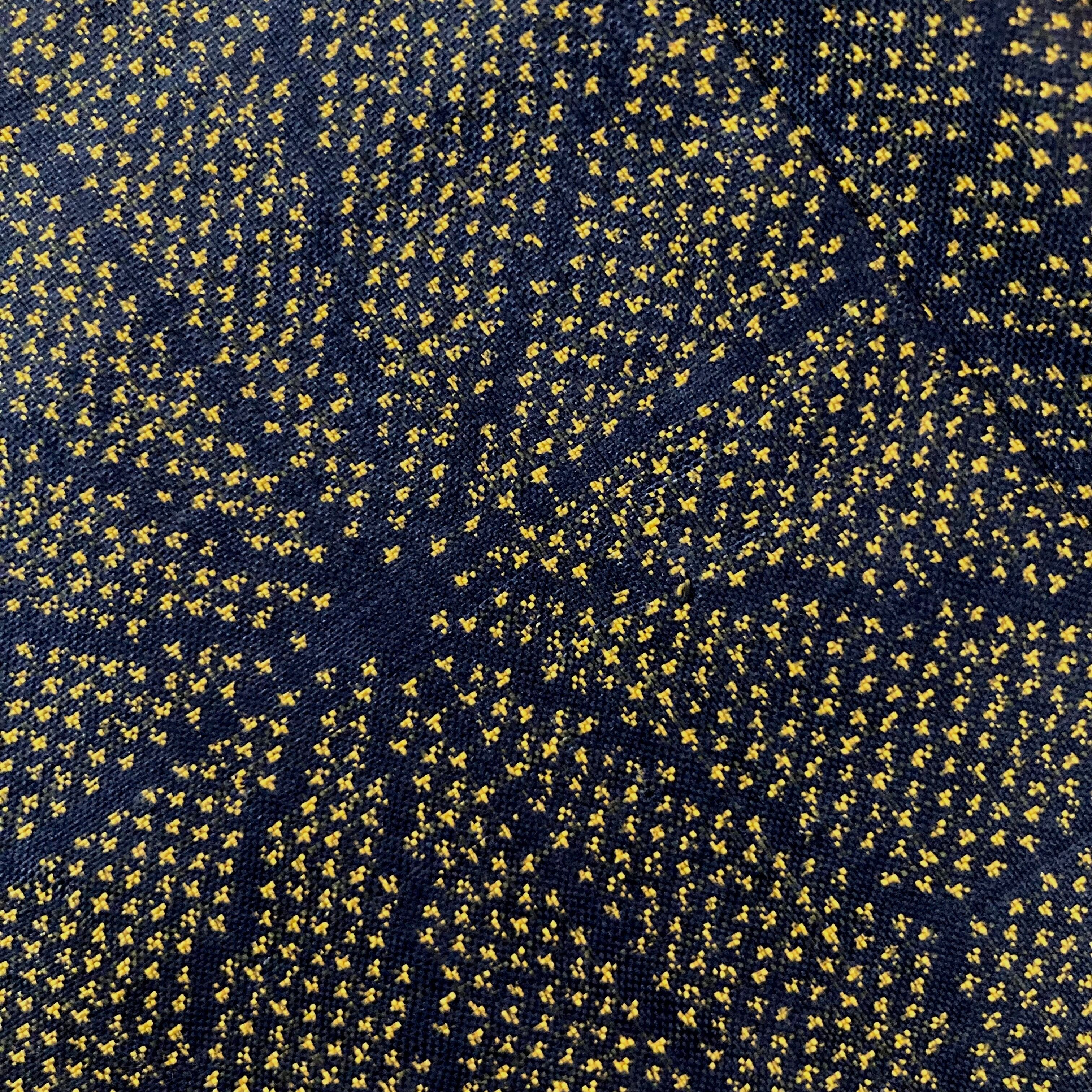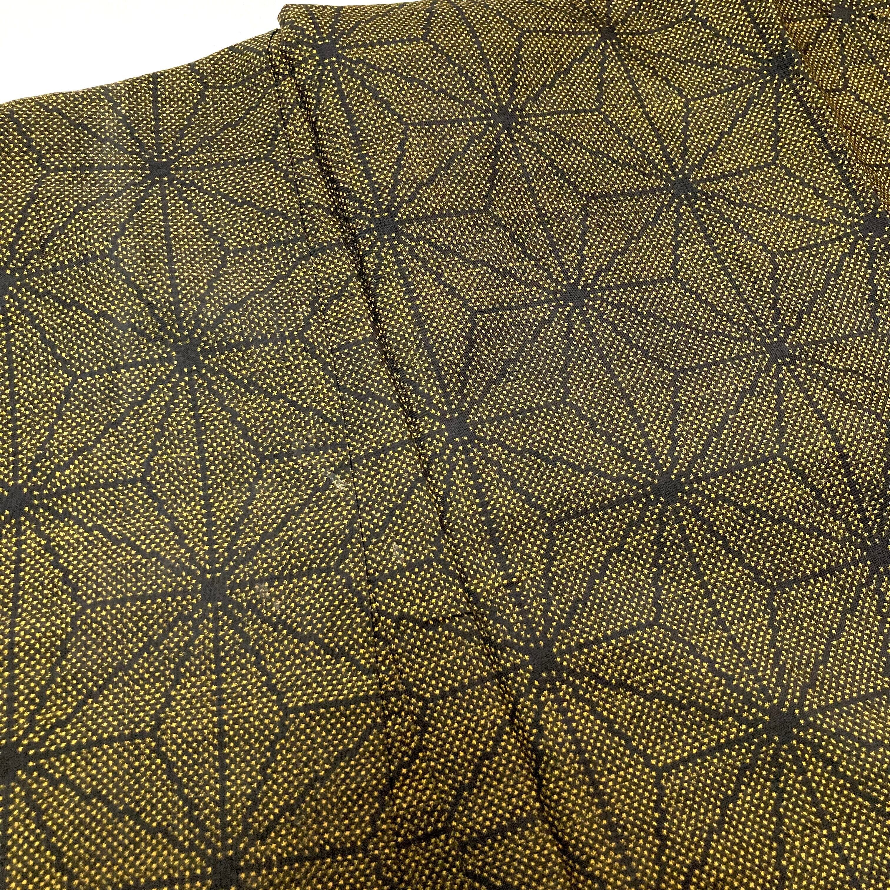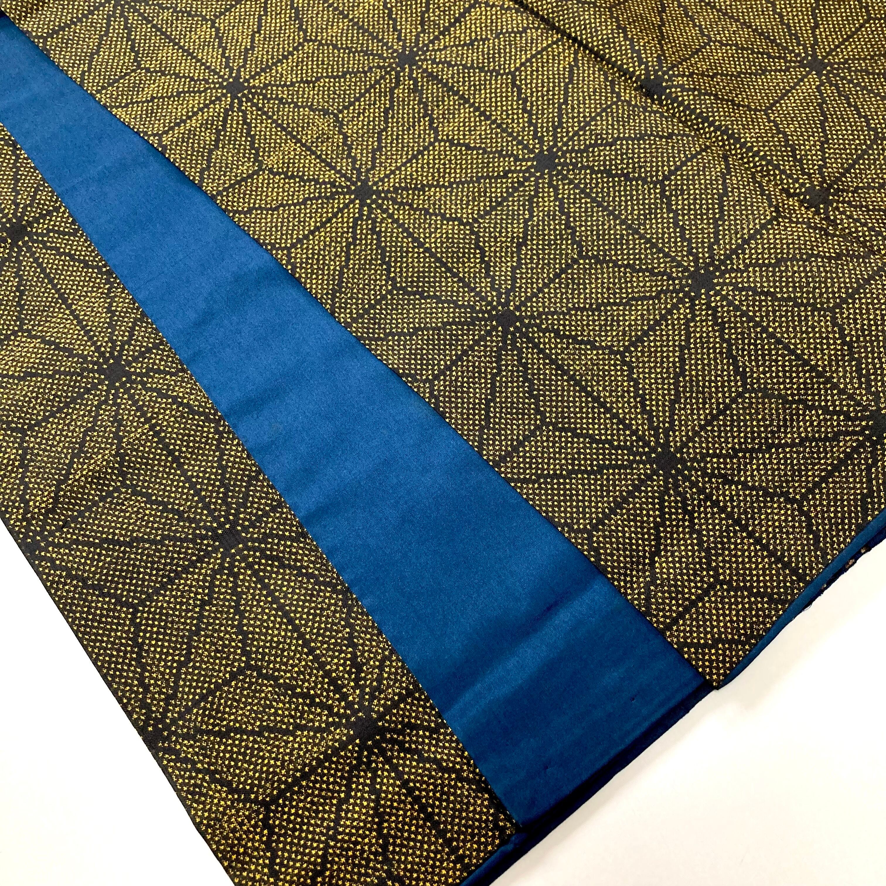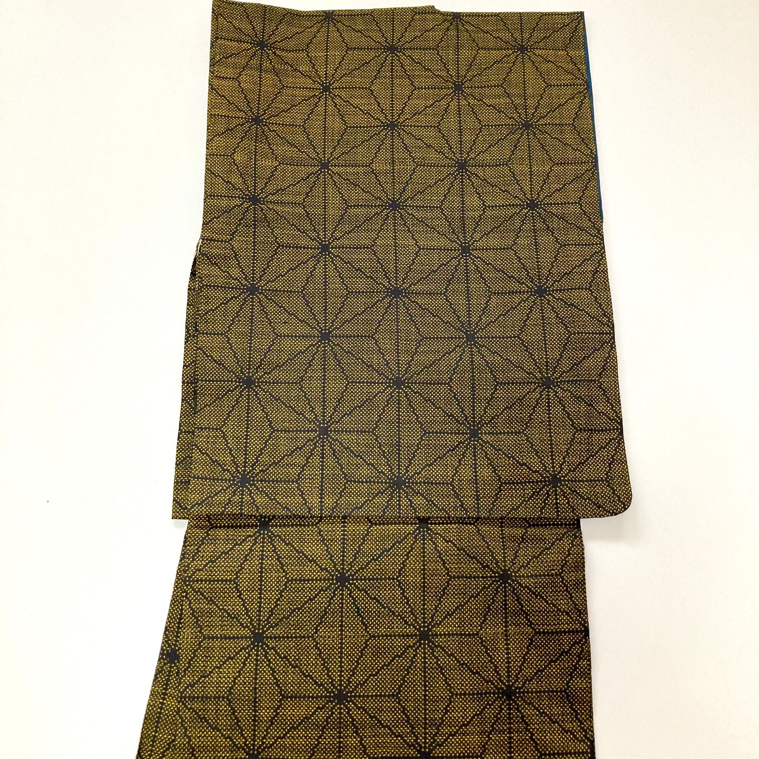 広衿仕立ての黒地に黒地に黄色の麻の葉模様。紺地の八掛がなんともお洒落な大島紬で、レトロ風はもちろん、モード系の着こなしもしていただけるかと♪ 八掛の擦り切れ、胴裏にしみなどございますがまだまだご活躍いただけます。
