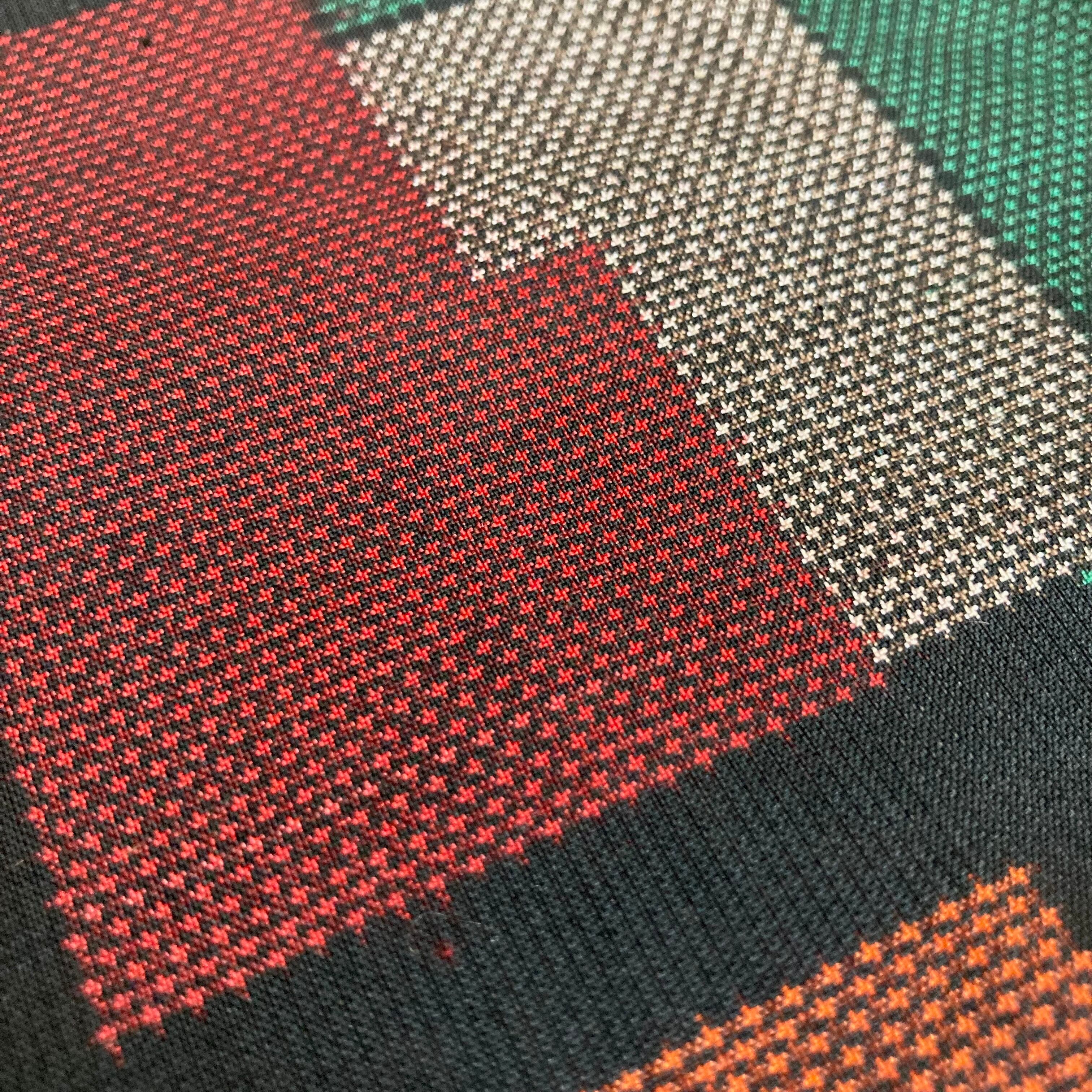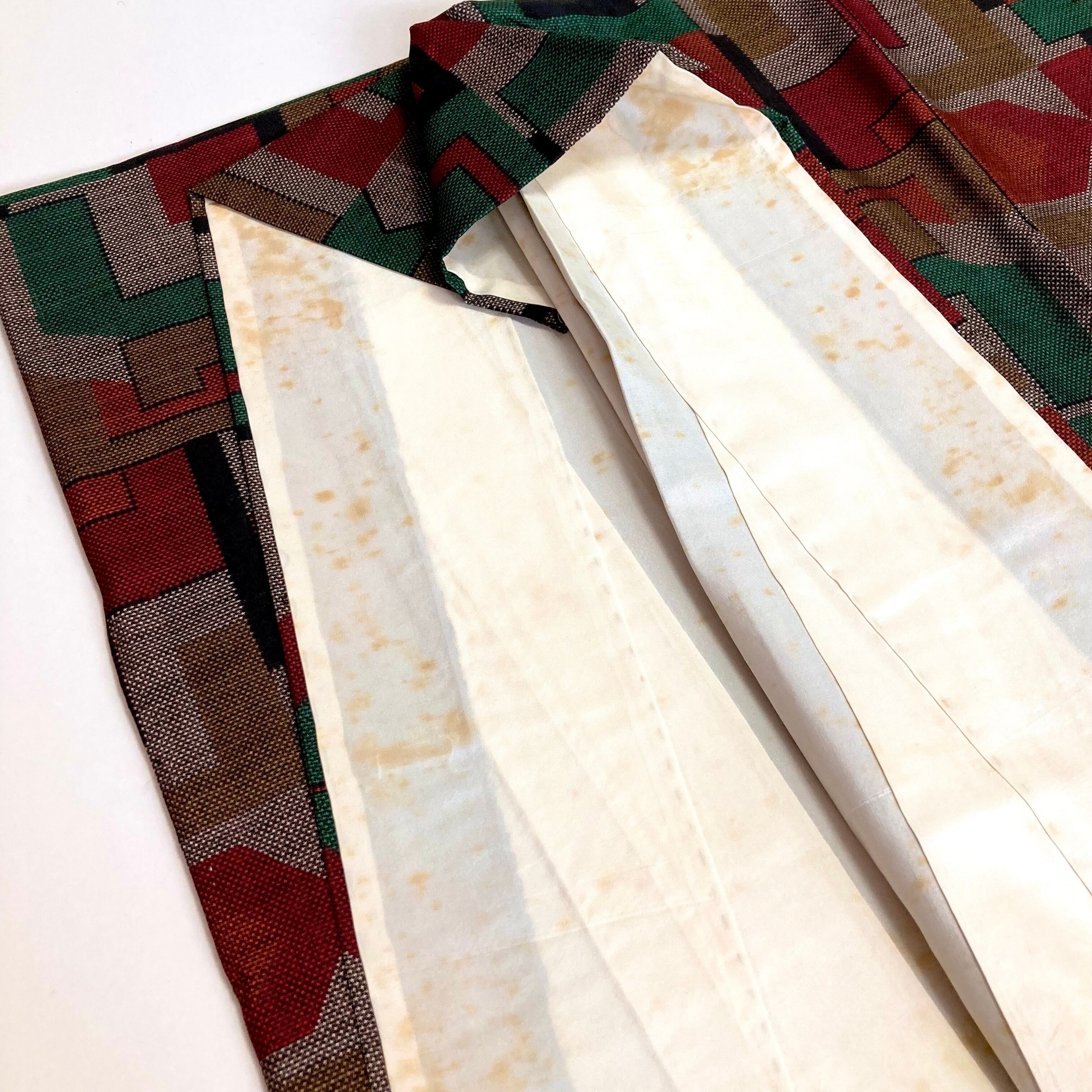 モダンな柄の色大島紬です。幾何学模様なので、いろんな柄の帯とコーディネートを楽しめます。広衿仕立て、しつけ糸有です。着用されていないようで、美品です。ただ、胴裏全体にしみがありますが、八掛はきれいです。